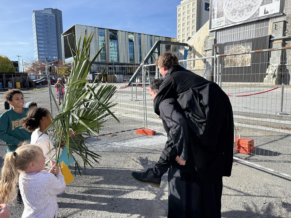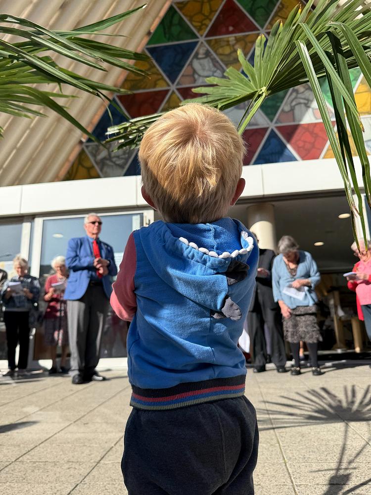 An additional [and adorable] photo of a child holding a palm branch in front of the Transitional Cathedral on Palm Sunday.